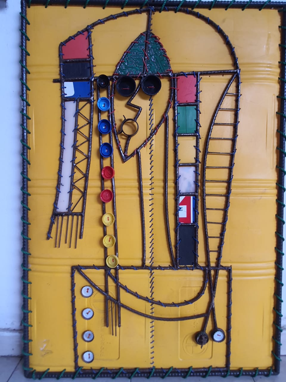 Justin Oussou, tenant de l’art kangourou crée une intimité, une complicité, un contact permanent entre la matière, le matériau et le support pour en faire un atout indissociable.