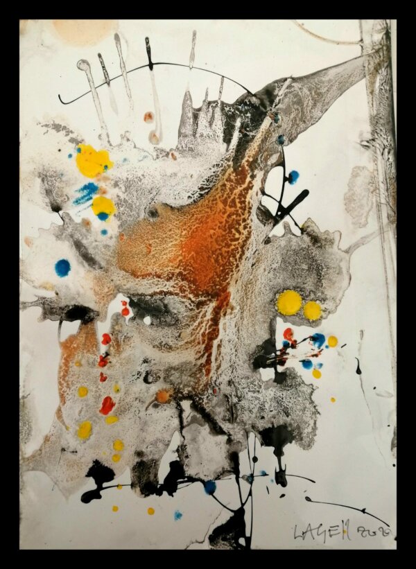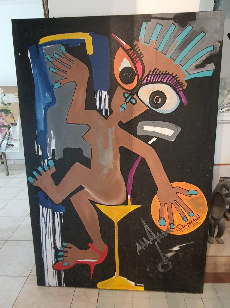 Monné Bou peintre du jet, pratique une sorte de dripping qui accentue sa vision mystique, donnant à ses la profondeur d’une apparition fantasmatique.