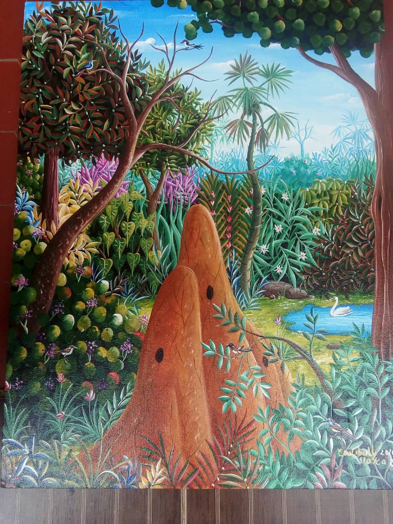 Le peintre ivoirien aime dialoguer avec les arts consommés de l’Occident, tout en manifestant sa spécificité. Les rythmes, les couleurs, les règles de l’harmonie, les thèmes, répondent à d’autres sensibilités : si l’objet parait dissymétrique, les symboles hermétiques, ils correspondent une tradition culturelle. Cet artiste a le goût de son passé, éprouve le besoin de s’y enraciner. La tradition orale, sa mystique est pour lui une source précieuse d’inspiration : couleurs, signes deviennent des symboles.